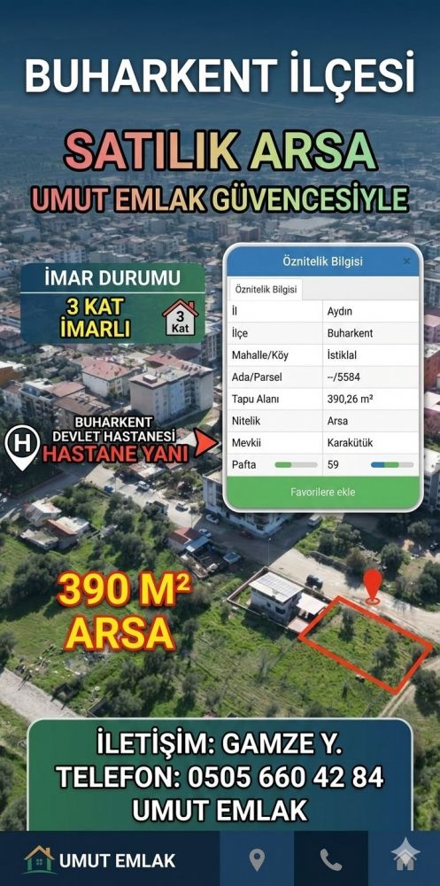 ​​Mahalle: İstiklal (Karakütük Mevkii) ​Ada/Parsel: 5584 Parsel ​Alan: 390,26 m^2 ​İmar Durumu: 3 Kat İmar İzinli ​Nitelik:Arsa (Müstakil Tapu)