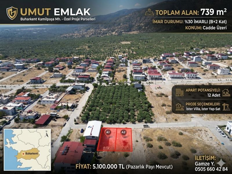 AYDIN BUHARKENT KAMİLPAŞA MH. 413 M2 İMARLI ARSA B+2 KAT %30 İMAR HAKKI MEVCUTTUR YOLA 15.8 M CEPHESİ MEVCUTTUR